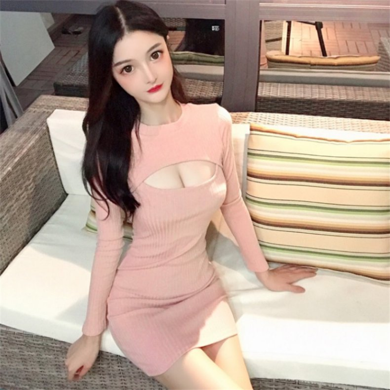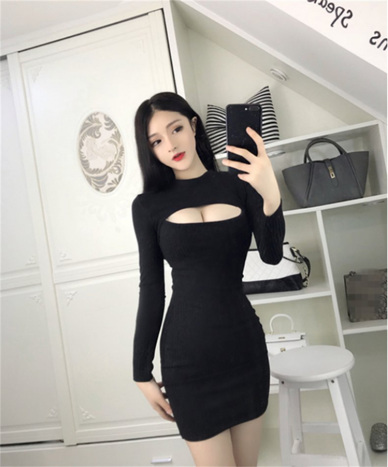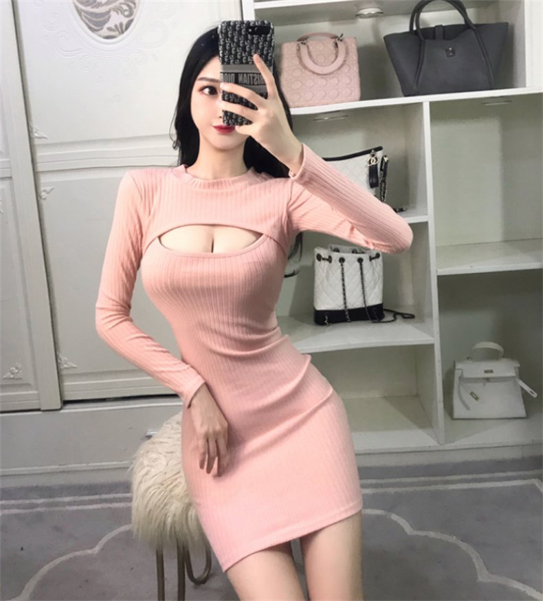 胸元に大胆なカットアウトを施したリブニットミニワンピース。