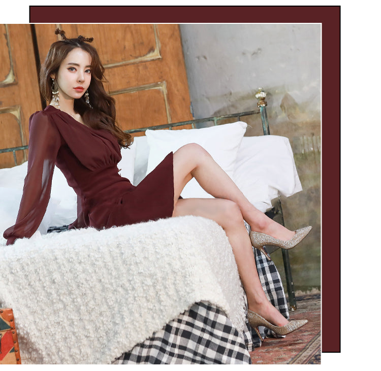 着るだけで、惹きつける。大人の色香漂うワンピース。 ほんのり透け感のある柔らかな生地が、上品な色気を演出。デコルテを美しく見せる深めのVネックが、女性らしさを最大限に引き出し、洗練された大人の魅力を漂わせます。