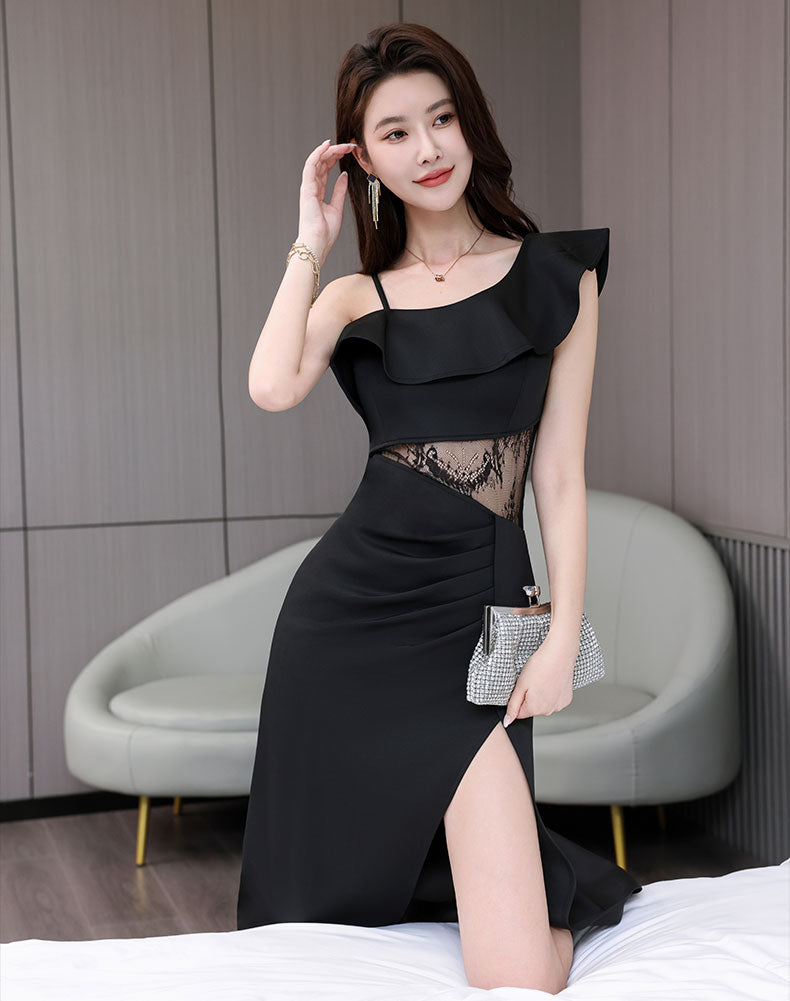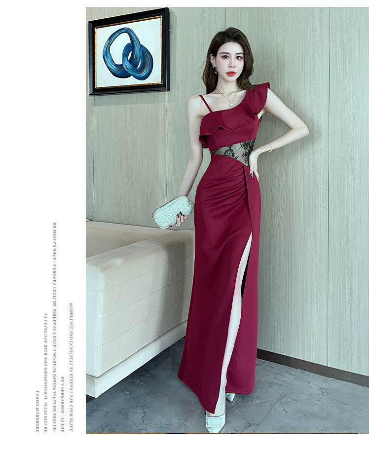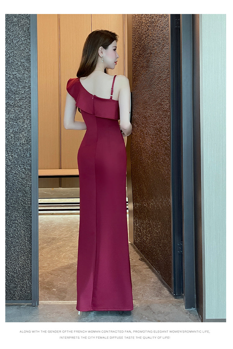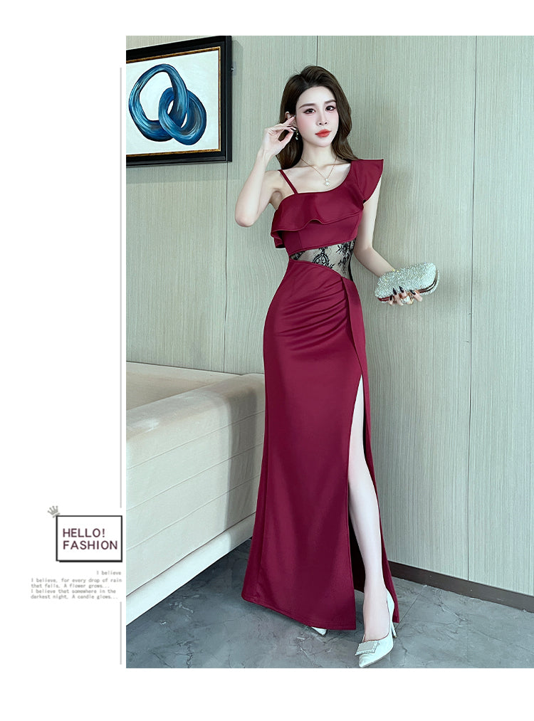 甘くない、媚びない。潔い色気で、視線を惹きつける。 潔くカッティングされたアシンメトリーなショルダーラインが、洗練されたデコルテを演出。対照的に、深く入ったサイドスリットからは、歩くたびに脚線美が大胆に覗き、見る人をドキッとさせる仕掛けに。甘さを削ぎ落としたデザインだからこそ、大人の女性が持つ本来の美しさと自信を引き出します。