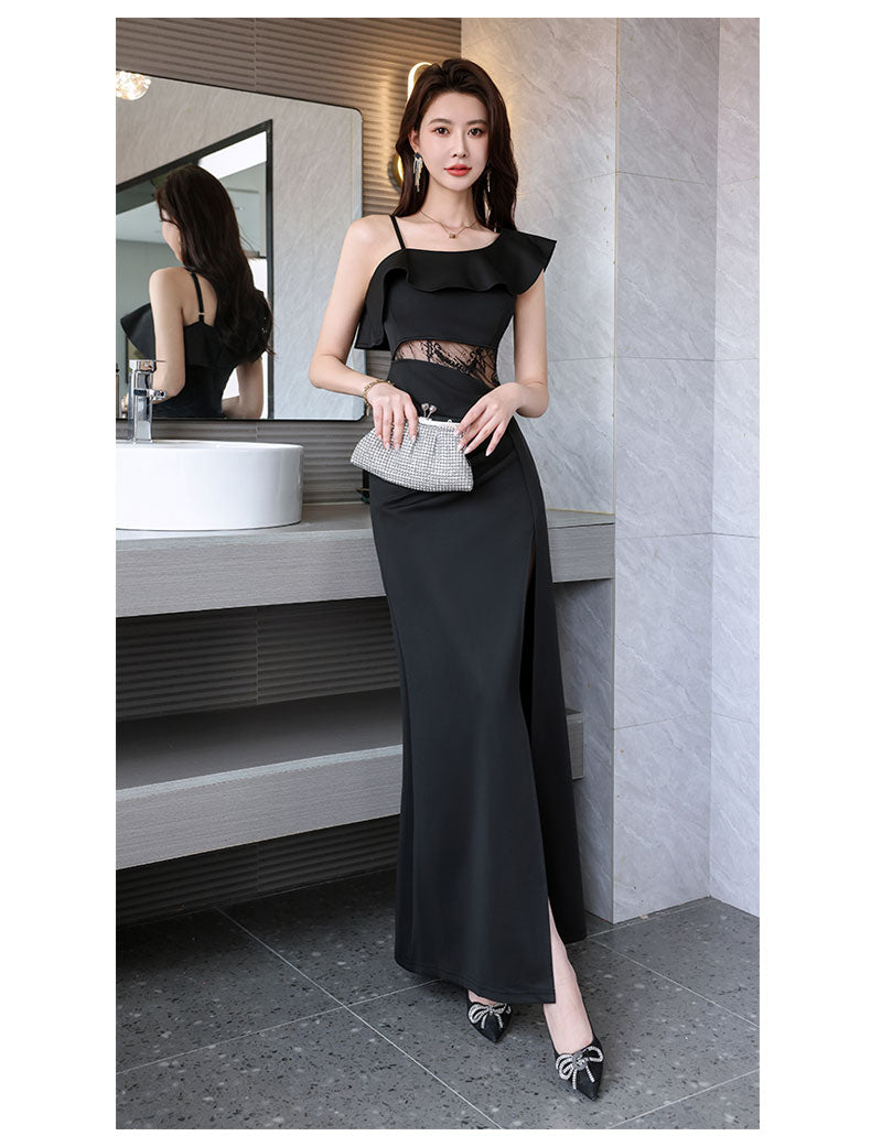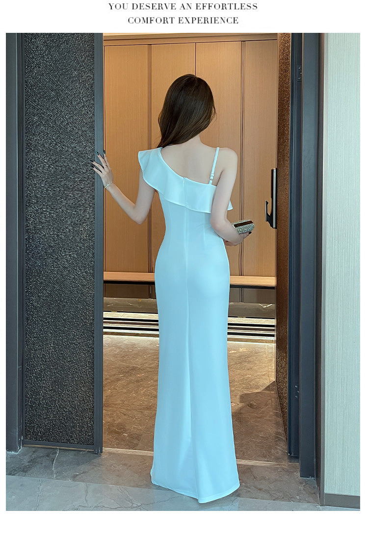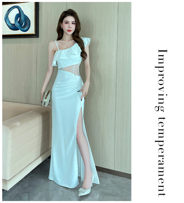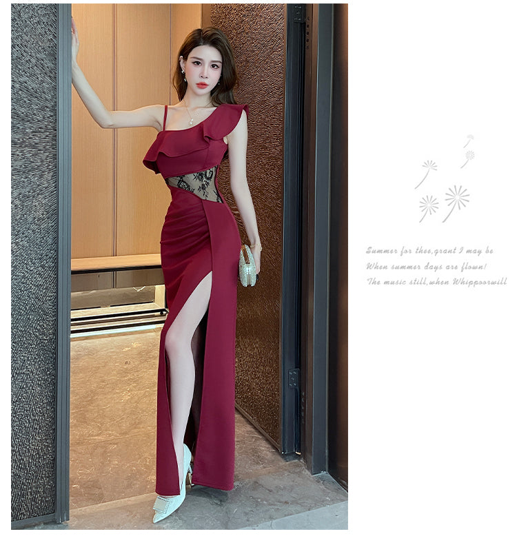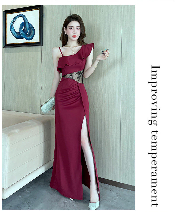 甘くない、媚びない。潔い色気で、視線を惹きつける。 潔くカッティングされたアシンメトリーなショルダーラインが、洗練されたデコルテを演出。対照的に、深く入ったサイドスリットからは、歩くたびに脚線美が大胆に覗き、見る人をドキッとさせる仕掛けに。甘さを削ぎ落としたデザインだからこそ、大人の女性が持つ本来の美しさと自信を引き出します。