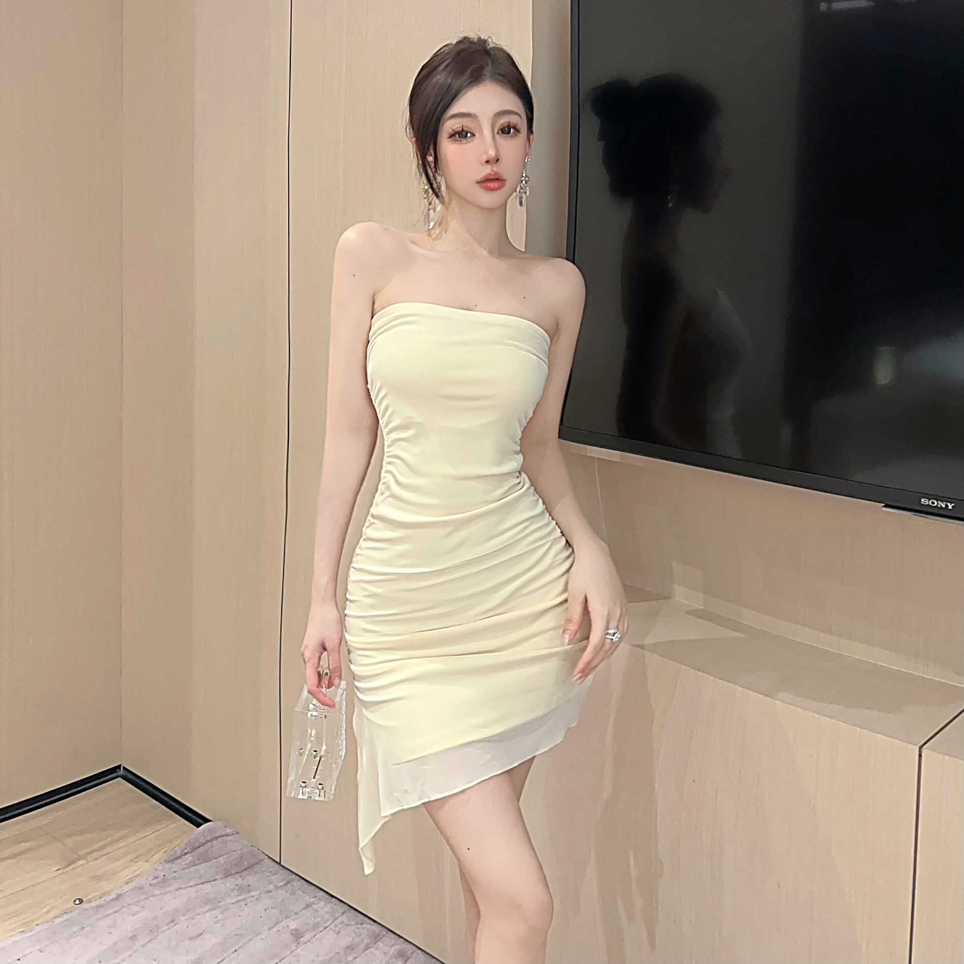 ストラップレスアシンメトリードレープミニドレス